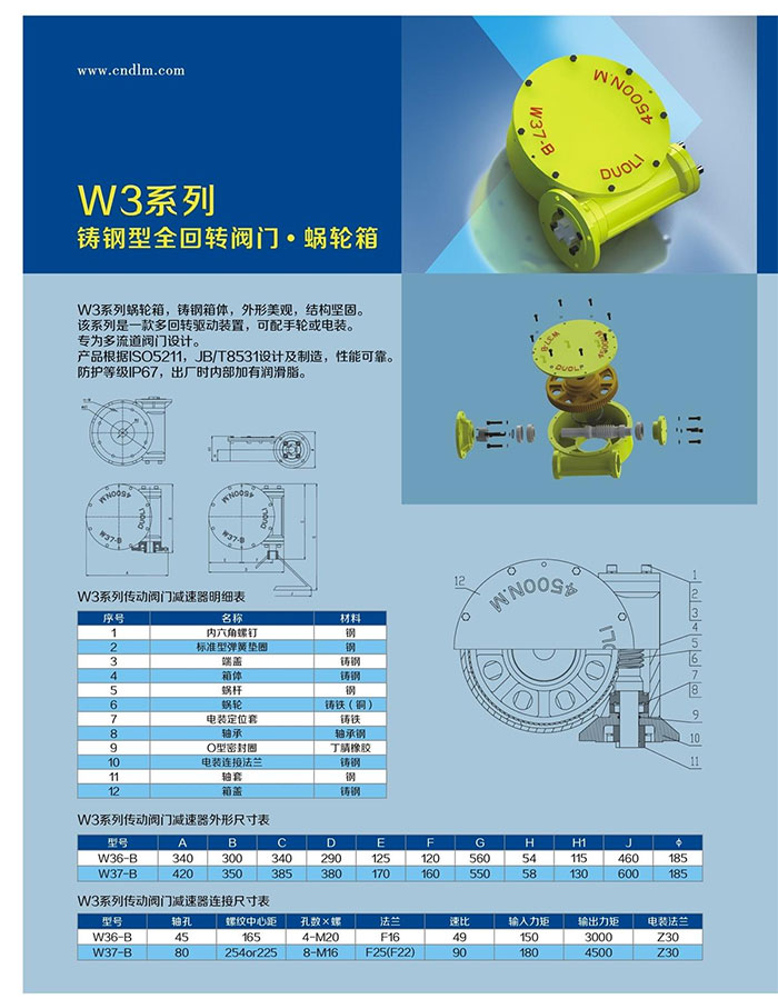 | W3系列蝸輪箱,殼體采用WCB鑄造,蝸桿兩端使用圓錐滾子軸承支撐,該系列是一款多回轉(zhuǎn)驅(qū)動裝置,可選配手輪或電裝。適用于閘門,三通球閥等。 產(chǎn)品根據(jù)ISO5210和JB/T8531設(shè)計制造和檢驗,性能可靠防護(hù)等級可達(dá)IP67 使用注意事項:嚴(yán)禁超載使用,沒過三個月檢查各緊固螺栓,出廠時內(nèi)部加有少量測試用潤滑劑,安裝使用時請定期添加潤滑劑。