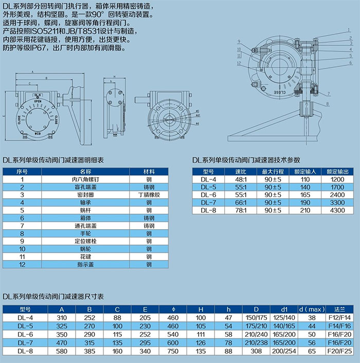 DL系列部分回轉(zhuǎn)閥門執(zhí)行器,殼體采用WCB鑄造,蝸輪采用QT500-7,蝸桿使用45鋼調(diào)質(zhì),蝸桿軸支撐使用圓錐滾子軸承更科學。適用于球閥、蝶閥、旋塞閥等角行程閥門。產(chǎn)品按照ISO5211和JB/T8531設計、制造與檢驗。蝸輪與軸套采用花鍵連接,使用方便,出貨更快。產(chǎn)品防護等級有IP65,具有90±5°調(diào)節(jié)功能。